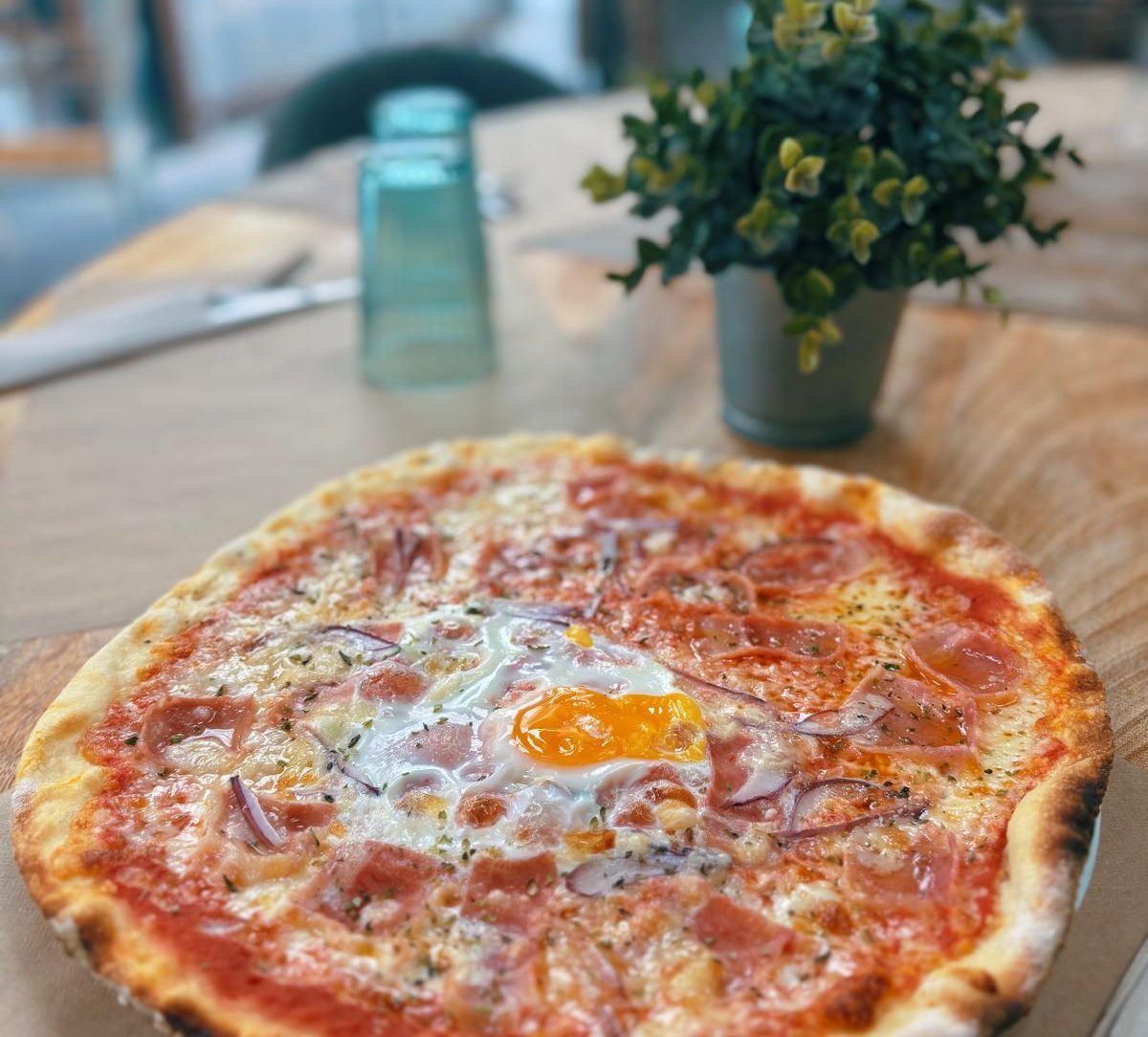 Nuestra especialidad: tomate, mozzarella, bacon, cebolla dulce, parmigiano y huevo. Pura tentación al horno.